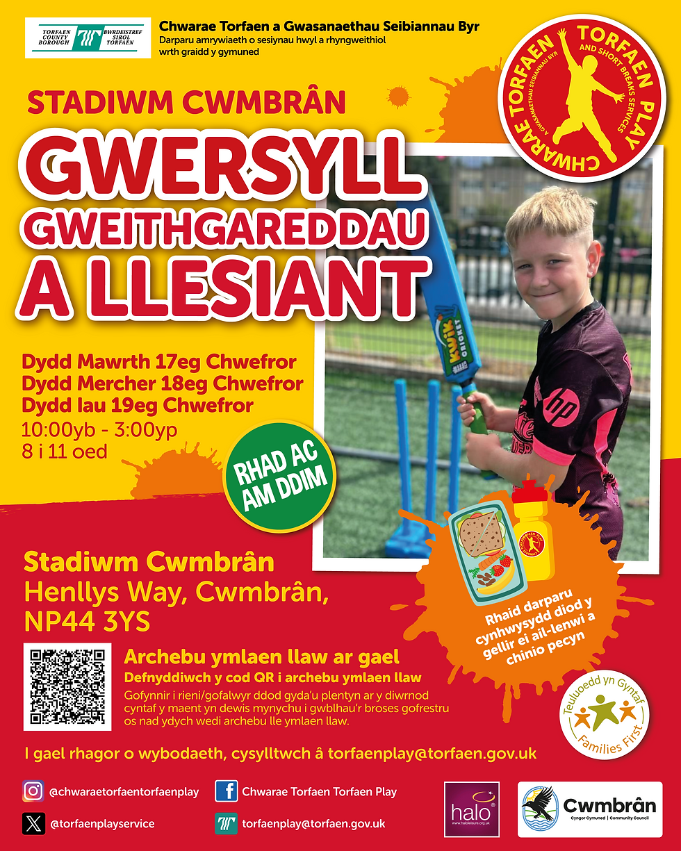 Bydd angen diod y gellir ei hail-lenwi a phecyn cinio ar blant, a chynhelir y sesiynau yn Stadiwm Cwmbrân, Ffordd Henllys, NP44 3YS. Am fwy o fanylion, cysylltwch â torfaenplay@torfaen.gov.uk neu dilynwch @torfaenplayservice ar gyfryngau cymdeithasol.